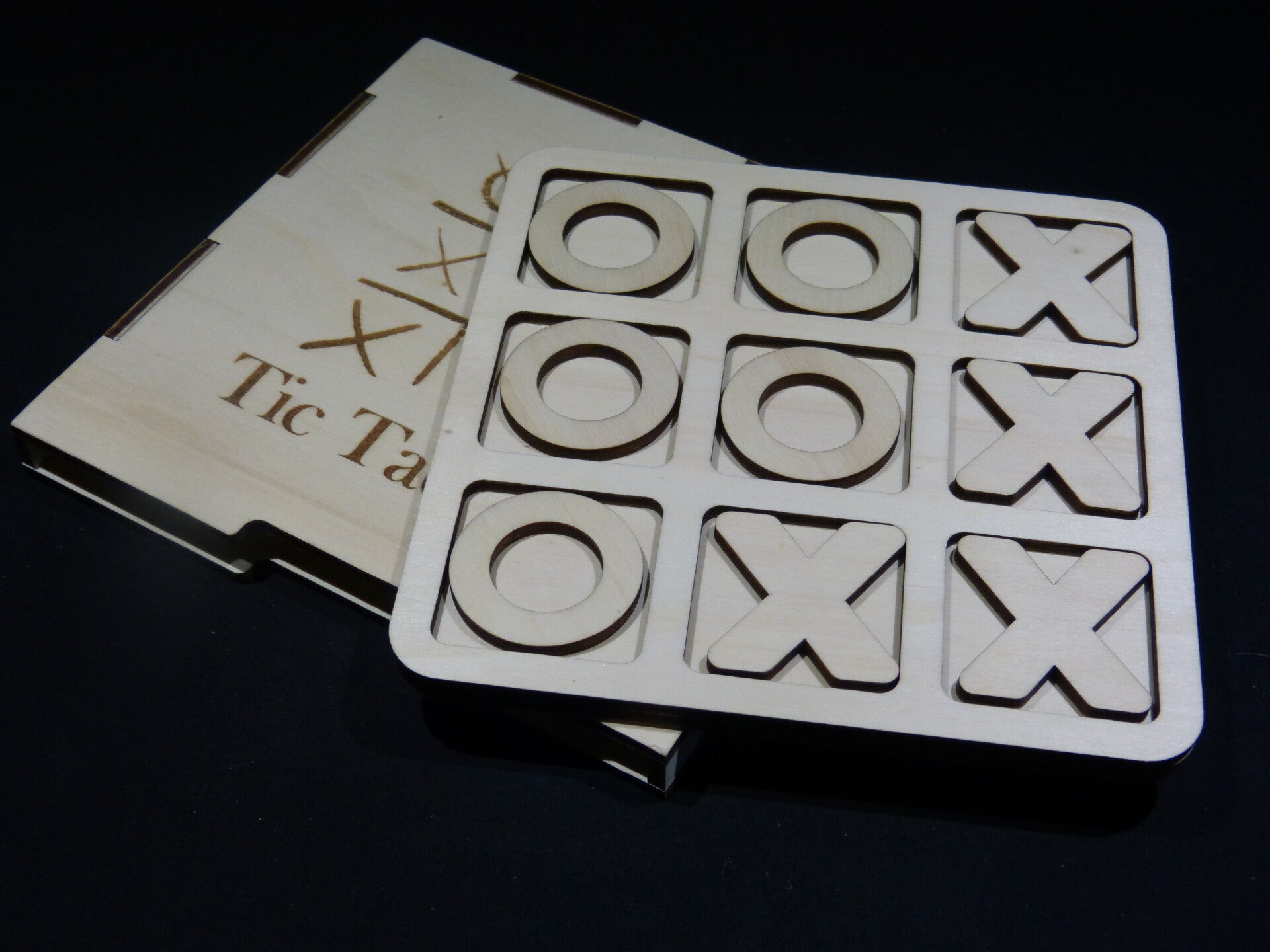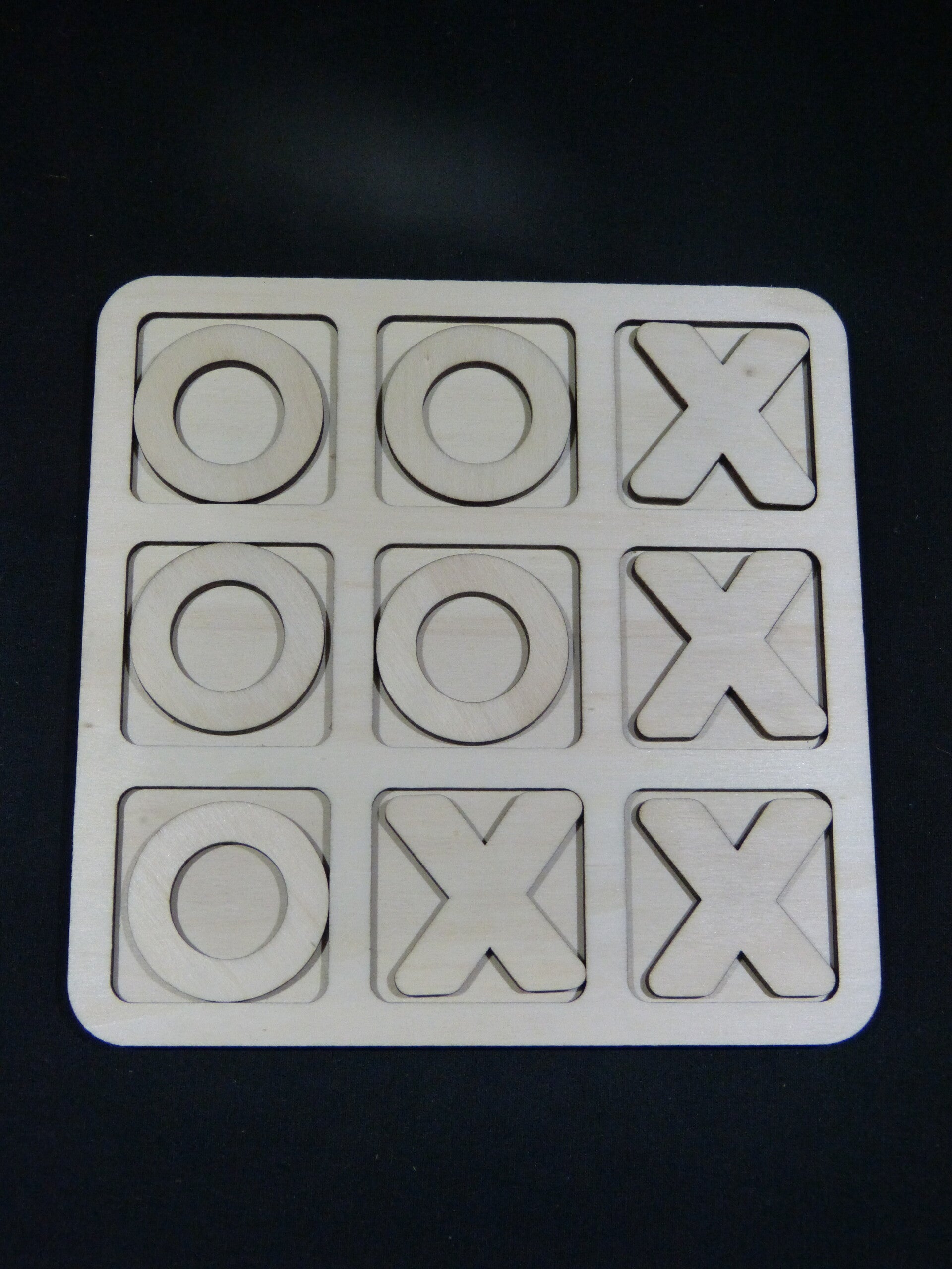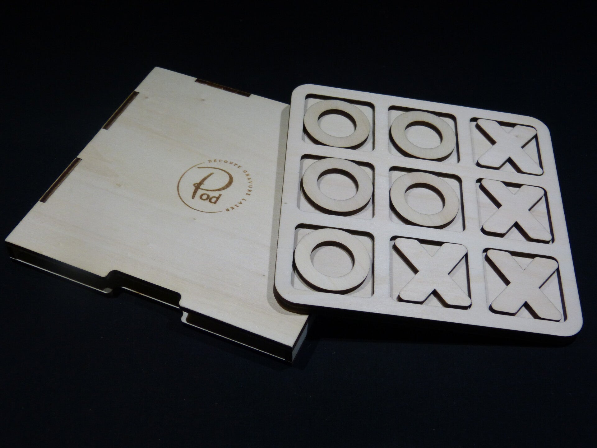 Jeu de Morpion incluant 5 ronds et 4 croix, accompagné d'un support et d'une boîte en bois. Les pièces mesurent 0,5 cm d'épaisseur.