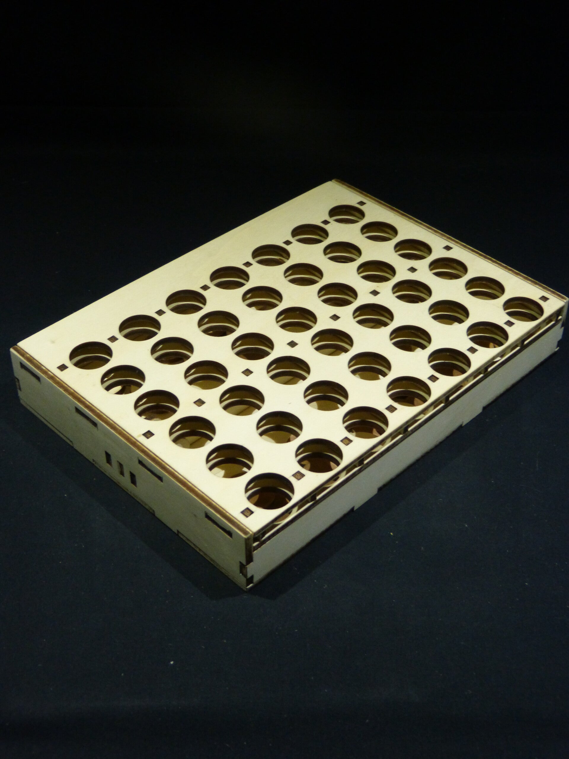 Le jeu de Puissance 4 comprend un plateau de 42 trous et des jetons, 21 marrons et 21 blancs. Chaque pièce mesure 0,5 cm d'épaisseur.