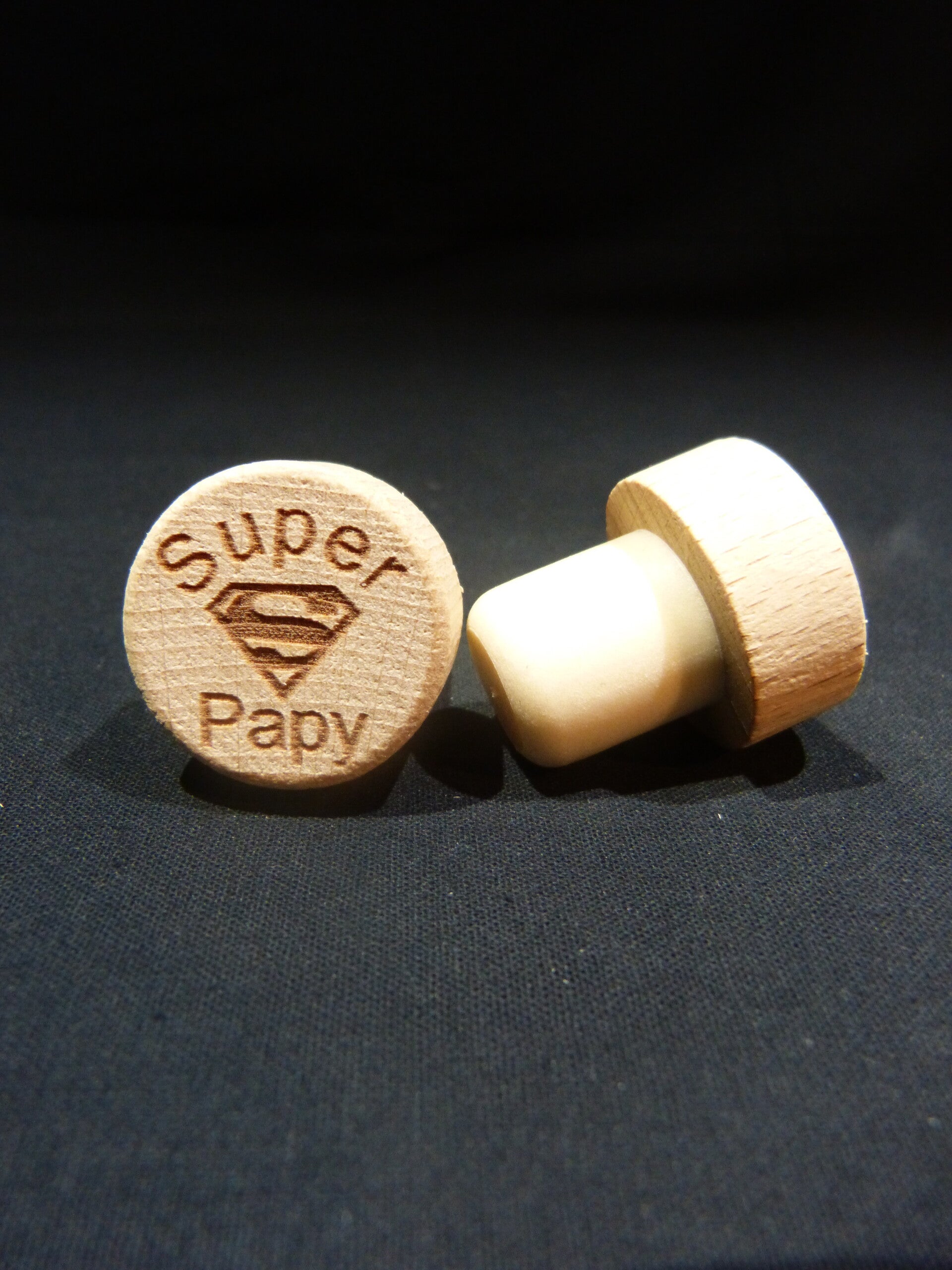 Un bouchon en hêtre personnalisé avec motif spécial Papi au choix.