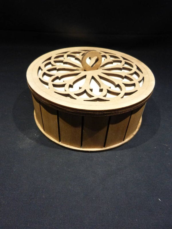 Une boîte à gâteaux ronde (la boîte foncée est teintée avec du brou de noix).